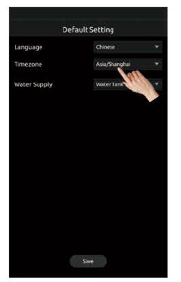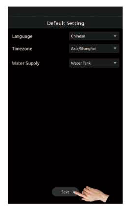 Bước 1: Nhấn vào tùy chọn menu trên màn hình và nhập các giá trị ban đầu tương ứng trên màn hình (Ngôn ngữ/ Múi giờ địa phương/ Phương thức cấp nước cho máy)