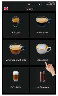 Bước 1: Nhấn chọn đồ uống chứa sữa trên màn hình menu. Ví dụ chọn “Cappuccino”, máy sẽ bắt đầu pha.