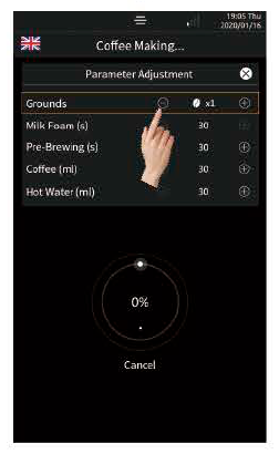 Bước 2: Trong quá trình pha, nhấn vào dấu “+” trên màn hình để mở cửa sổ điều chỉnh thông số, sau đó nhấn “–” hoặc “+” để tạm thời điều chỉnh lượng pha. (Chỉ áp dụng ở chế độ có thể điều chỉnh)