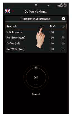 Bước 2: Trong quá trình pha, nhấn vào dấu “+” trên màn hình để mở cửa sổ điều chỉnh thông số, sau đó nhấn “–” hoặc “+” để tạm thời điều chỉnh lượng pha. (Chỉ áp dụng ở chế độ có thể điều chỉnh)
