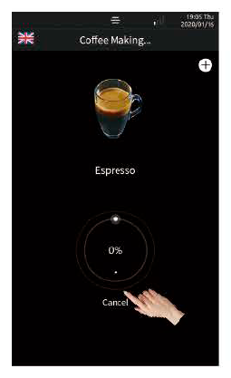 Bước 3: Khi máy đang pha, có thể nhấn “Cancel” để dừng pha cà phê ngay lập tức. Hoặc máy sẽ tự dừng khi đạt đến định lượng đã cài đặt sẵn.