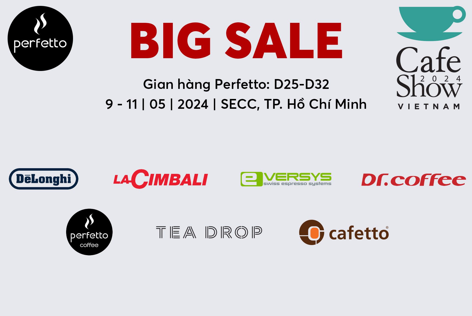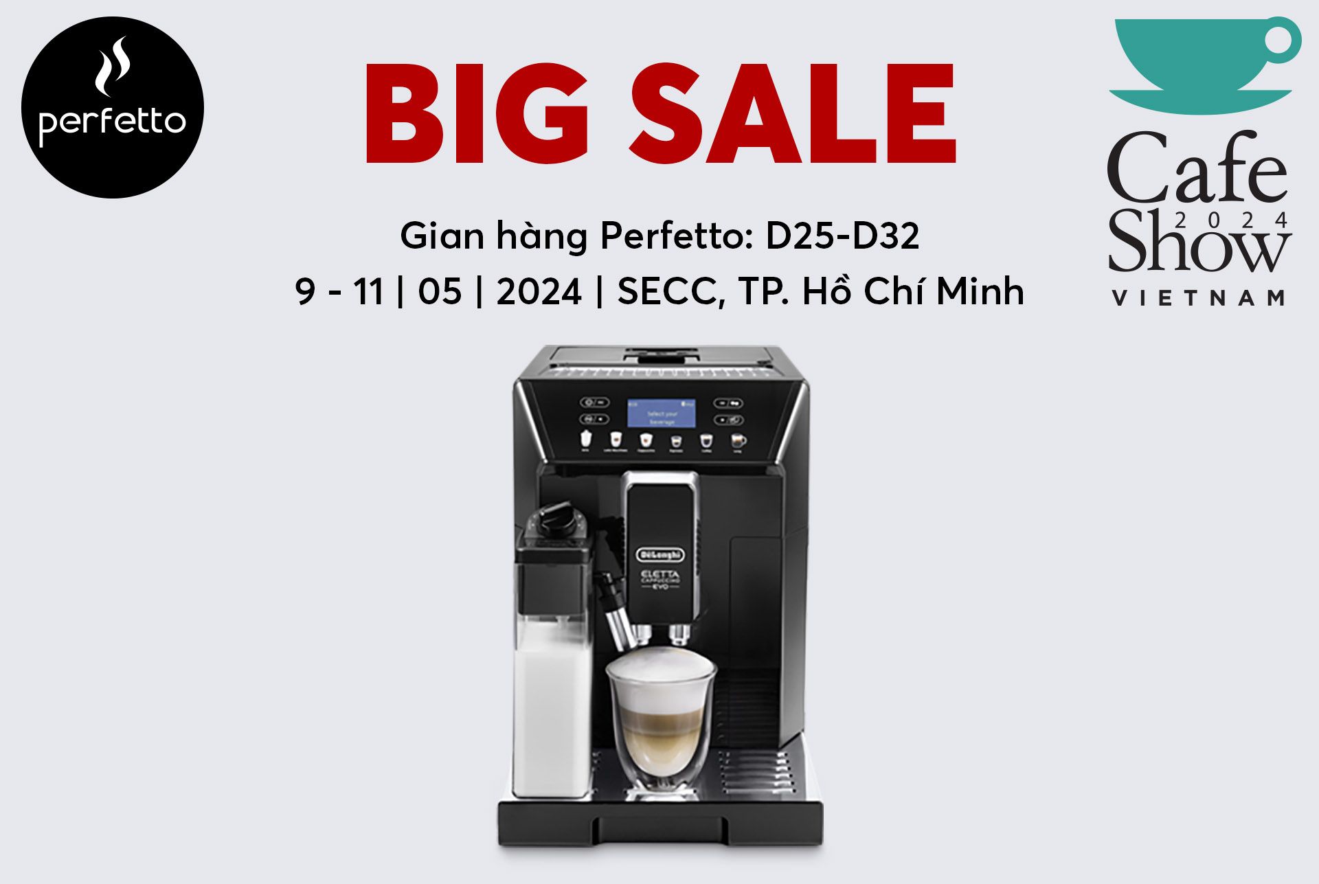 Ghé thăm gian hàng Perfetto tại triển lãm Quốc Tế Cafe Show 2024, từ ngày 9 – 11 Tháng 5 2024 để khám phá, trải nghiệm và đánh dấu sự khởi đầu một “Kỷ nguyên mới của máy pha cà phê” dành cho hệ thống HORECA, Gia Đình và Văn Phòng. Từ các thương hiệu hàng đầu Thế Giới: DeLonghi, Cimbali, Eversys, Cafetto, Tea Drop, Kenwood, Dr.Coffee, Nutribullet,...